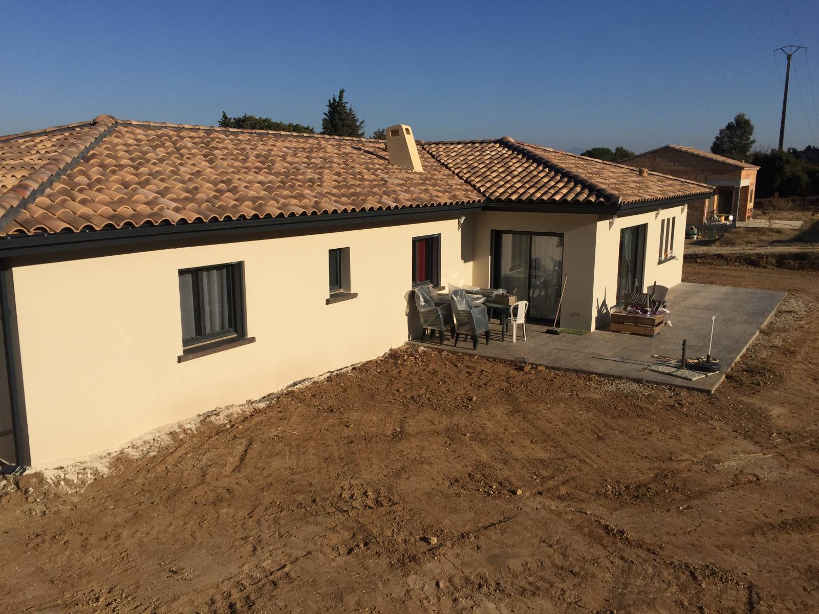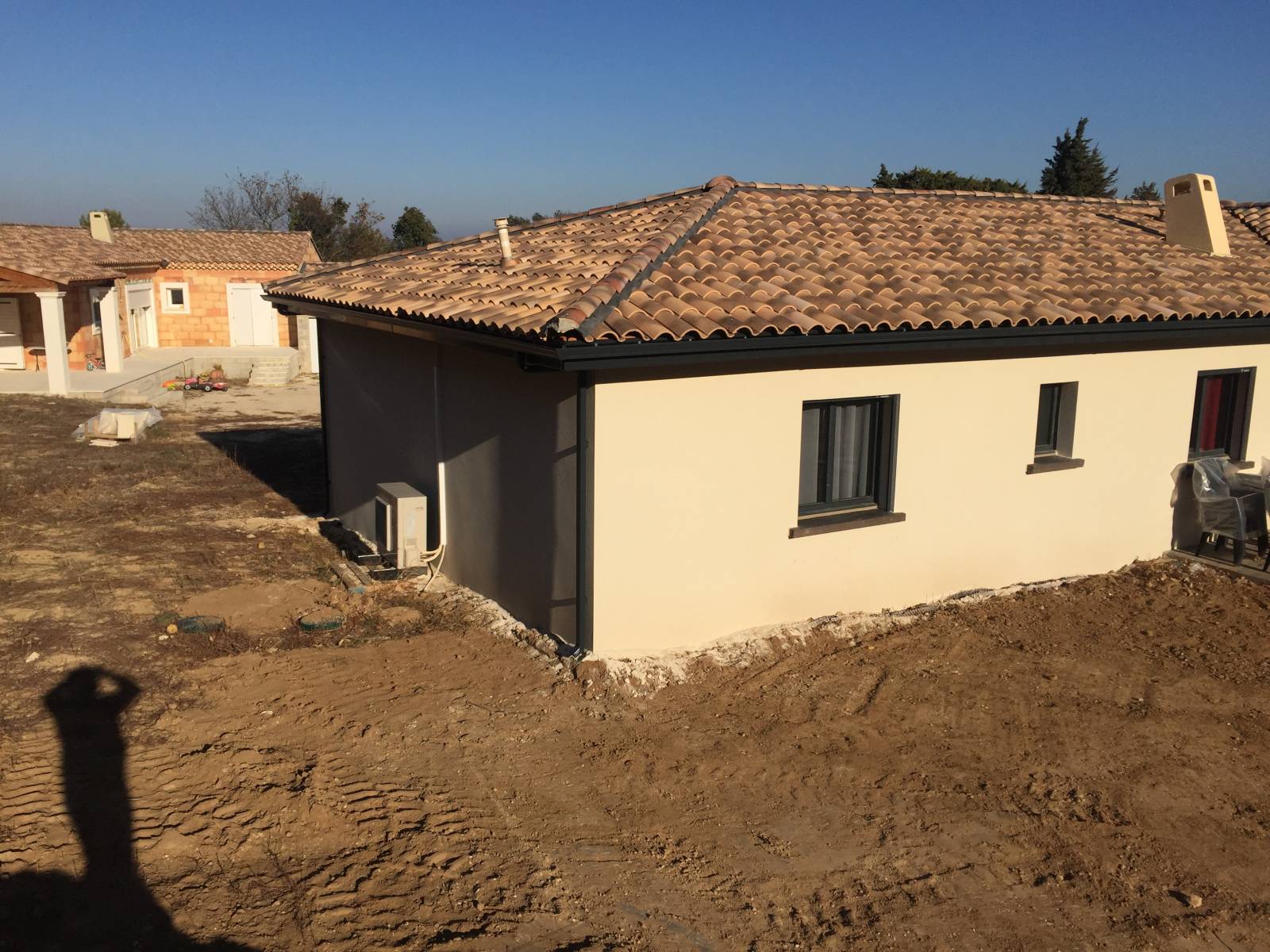 La maison présentée est équipée de gouttières aluminium G300 anthracite ainsi que de descentes d'eau pluviale 60x80 en aluminium également.