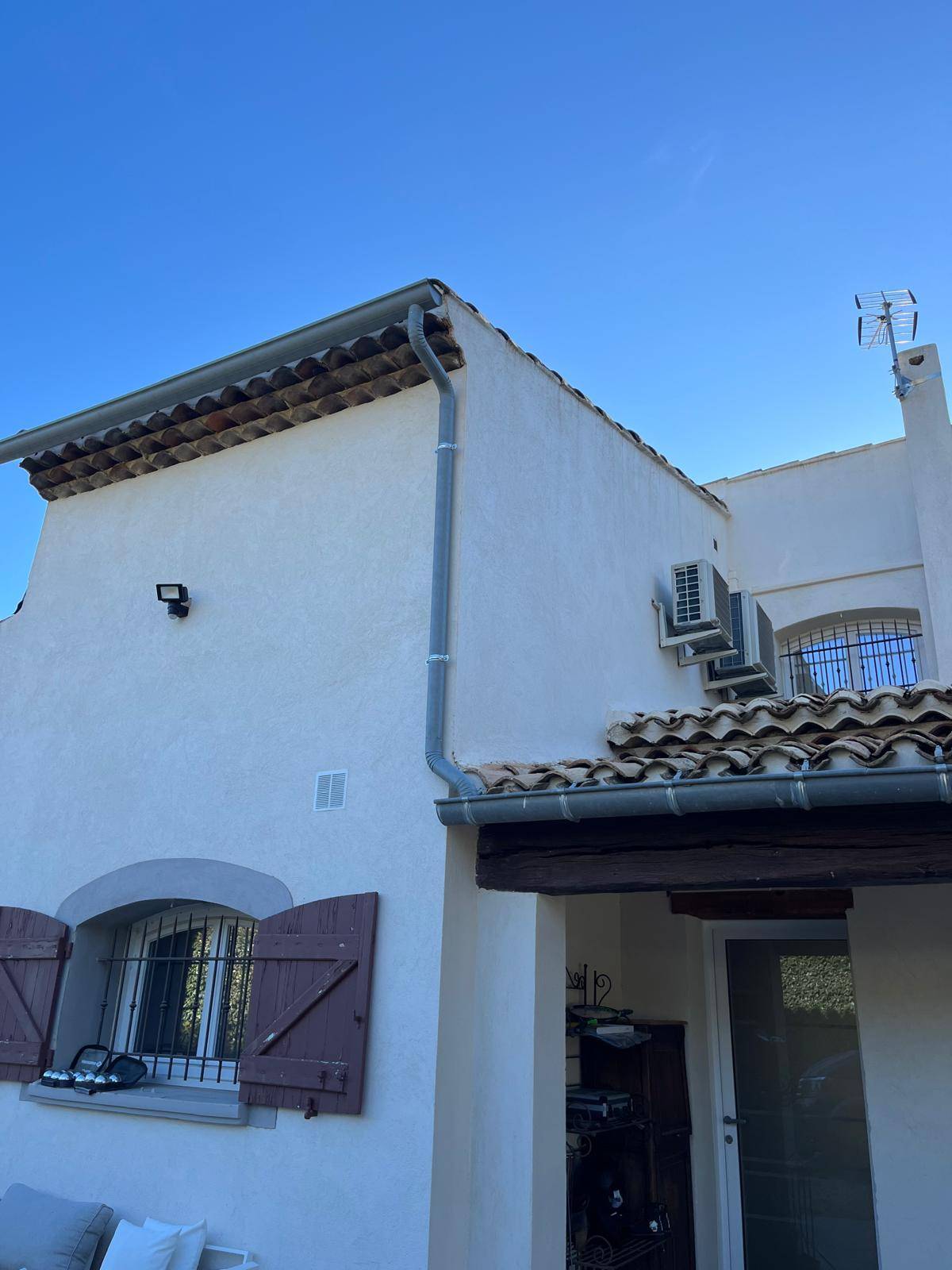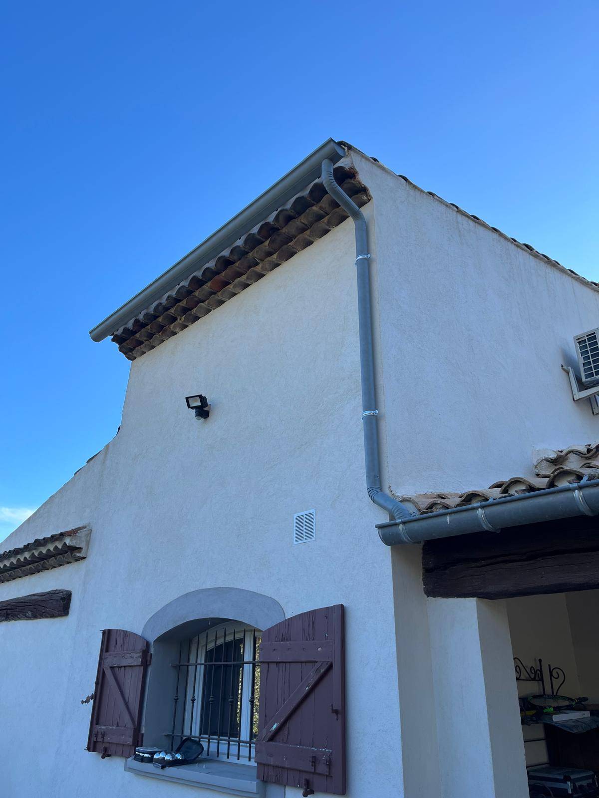 Une fois l'ensemble des gouttières aluminium réglées, nous procédons à la mise en place de descentes d'eau pluviale rondes en aluminium également.