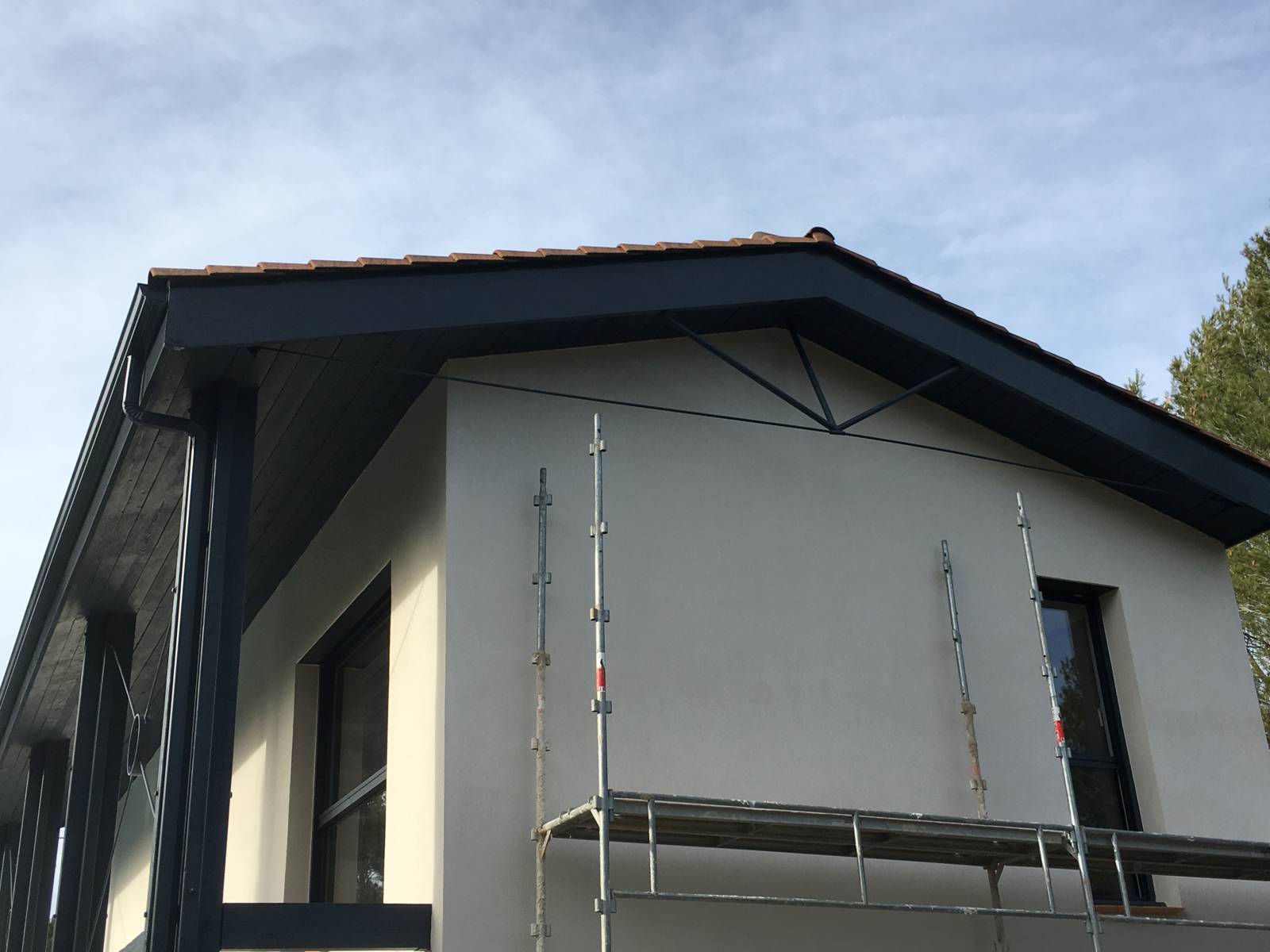 En plus des sous face aluminium noir sablé nous avons agrémenté de gouttières noir sablé G325 et de descentes en aluminium rondes en diamètre 80.